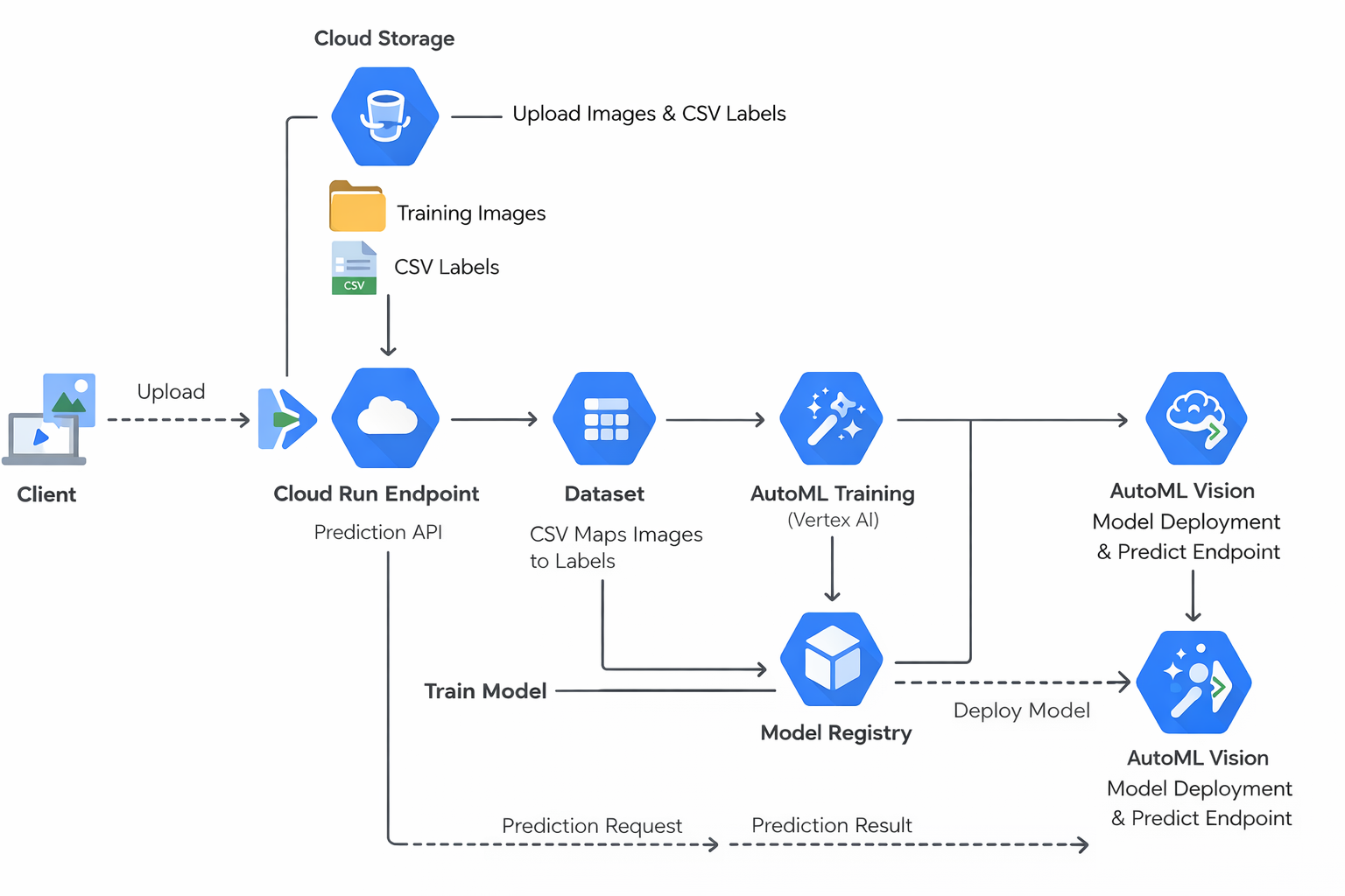 - 서비스: Cloud Storage, Vertex AI (AutoML), Cloud Run Endpoint