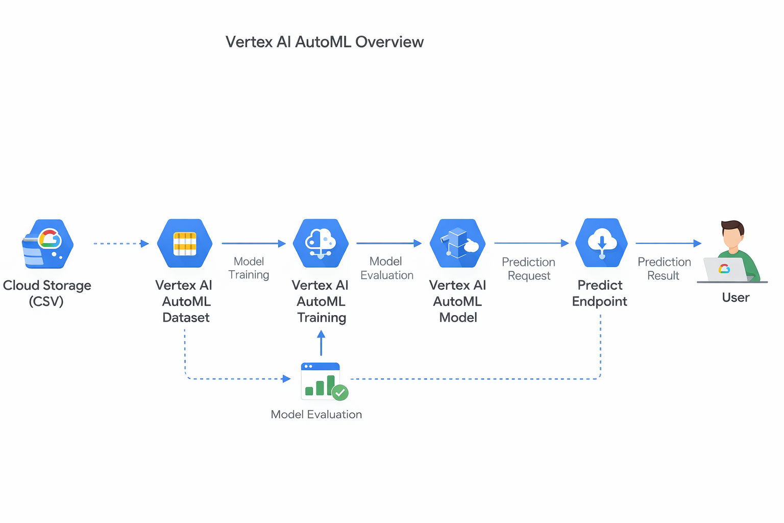 Cloud Storage (CSV) → Vertex AI Dataset → AutoML Training → Model Evaluation → Predict Endpoint / Prediction Result