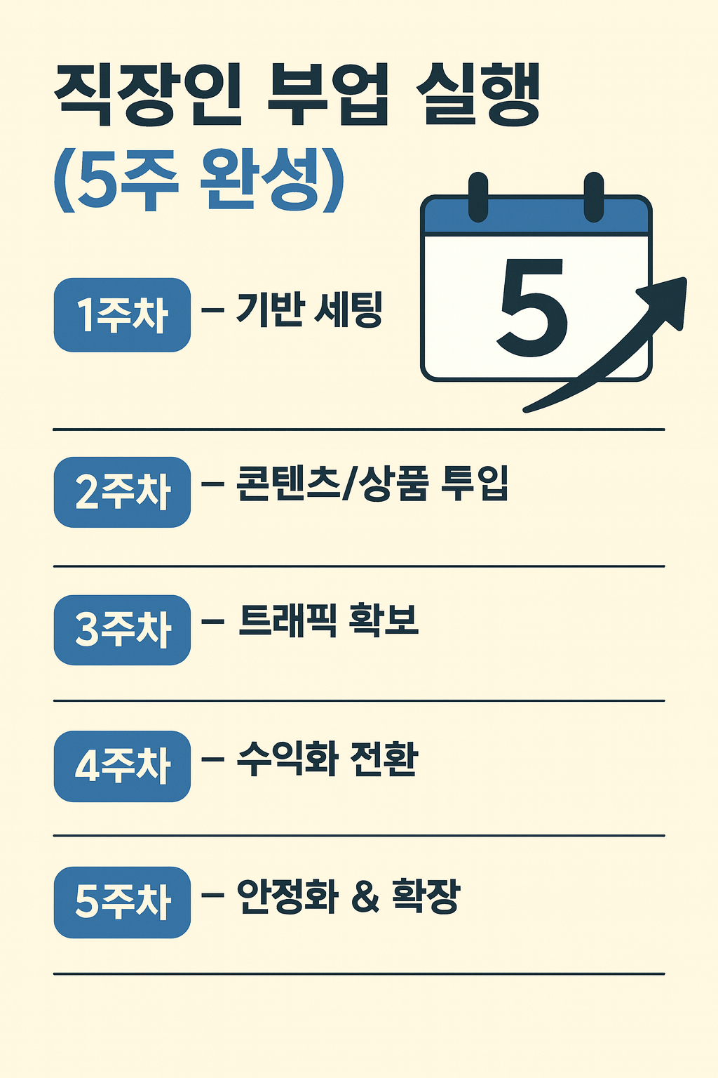 "직장인이 부업으로 월 50만 원 달성하는 5주 실행방법. 블로그, 제휴마케팅, 크몽, 역직구, 유튜브까지 실행 방법을 단계별로 안내합니다."